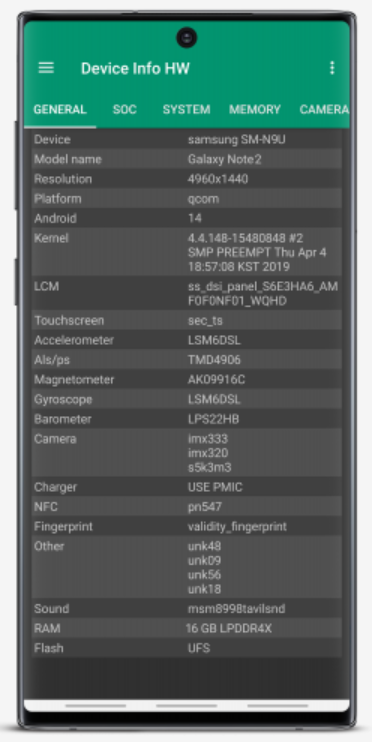 The app displays information about your device’s memory and flash components. It shows the type of LPDDR memory and, for some devices, the operating frequency. It also shows the chip and vendor for the eMMC or UFS (SCSI) flash storage. Additionally, you can go to the memory tab to see usage statistics for both memory and storage.